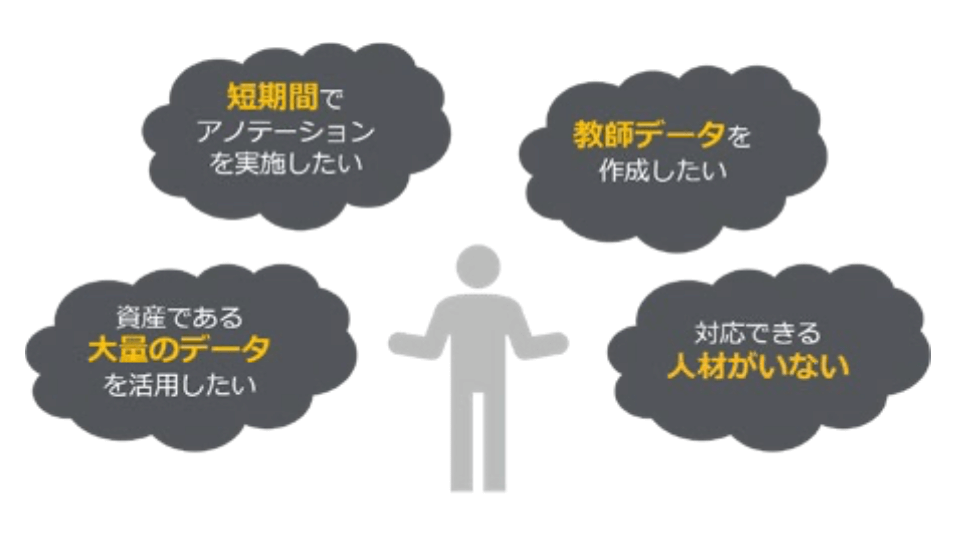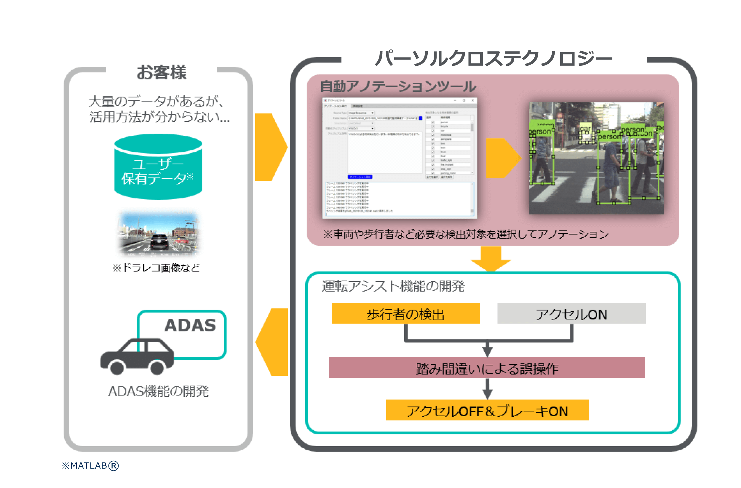 お客さまの資産であるドライブレコーダー画像などの大量のデータを活用し、ADAS(Advanced Driver Assistance System:先進運転支援システム)の新たな機能を開発できないか検討されており、運転アシスト機能の開発に向けた機械学習のため、教師 データを作成することになりました。