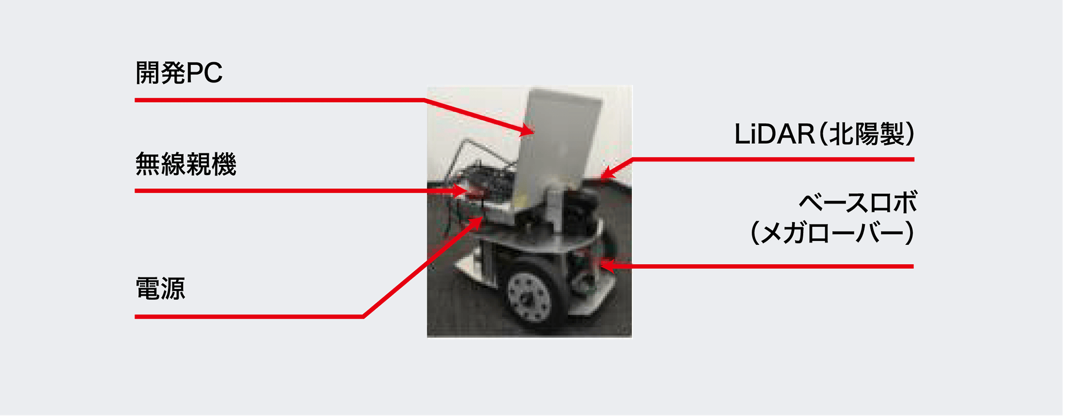 - 開発プラットフォーム構築市販の開発ベースロボットとLiDARを調達して自律移動の開発プラットフォームとなるロボット環境を構築。電源や無線環境、開発ノートPC等も整備。