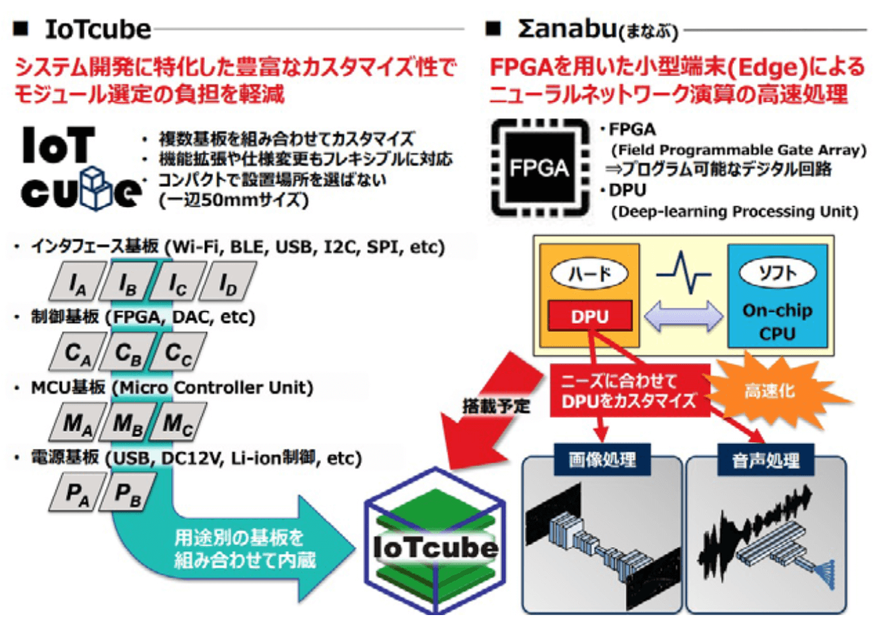 当社の“IoTcube”や“Σanabu”なら、IoTやEdge-AIの導入を手軽に実現できるため、ご提案しました。IoTcubeは、インタフェース基板(Wi-Fi、BLEなど)や制御基板(FPGA、DAC)などの複数基板を組み合わせ、フレキシブルな機能拡張や仕様変更が可能なIoTプラットフォームです。また、Σanabuでは柔軟にプログラム可能なデジタル回路であるFPGAを採用し、ニーズに合ったDPU(Deep-learning Processing Unit)を製品に搭載できます。