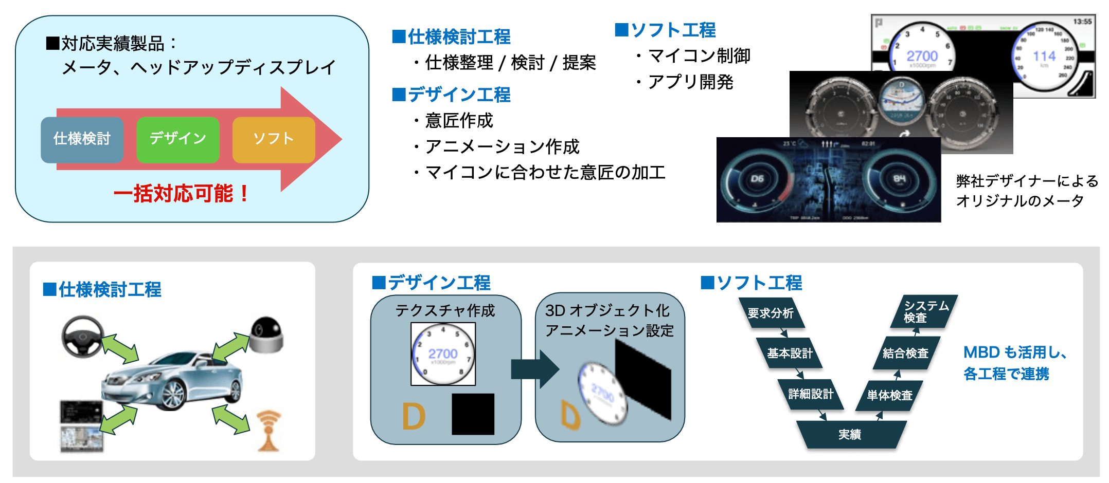 車載メーターやヘッドアップディスプレイを市場投入し、競争優位性を獲得するには、機能面ではなく意匠面での工夫が必要不可欠となります。そこで、ソフトウェア部分の開発だけでなく、オリジナルの意匠作成やアニメーション作成、マイコンに合わせた意匠の加工など、メーター意匠の知見のある企業を探されていました。
