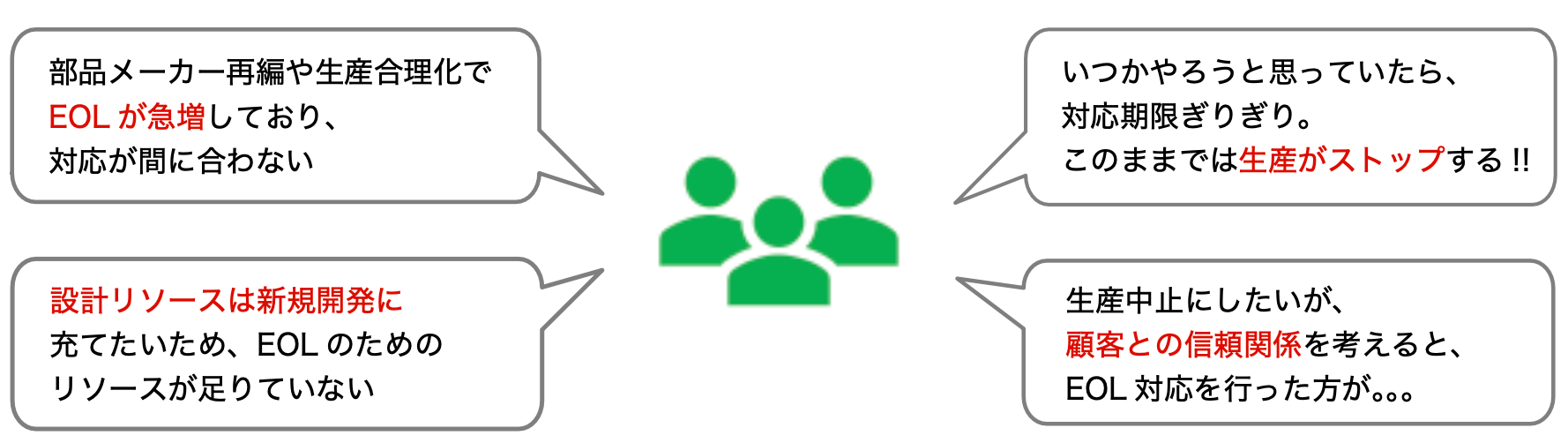 部品メーカーの再編や、生産合理化の動きによりEOLが急増しており、対応が追いつかない状況でした。EOL対応を実施しようと考えているうちに期限が迫ってしまい、このままでは生産をストップせざるを得ない状態でした。しかし、顧客との信頼関係を考えると、生産中止ではなくEOL対応を行うべきとの結論となり対応を急がれていました。
