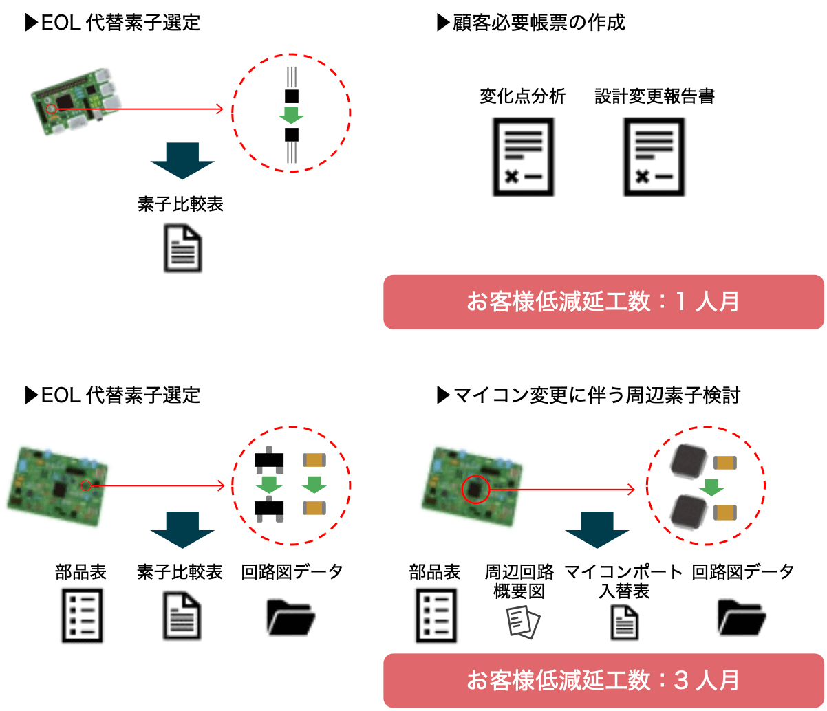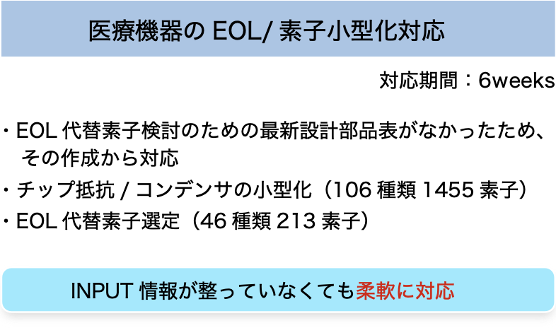 当社にご依頼頂き、医療機器、車載部品など、さまざまな量産製品のEOL対応をワンストップで実施できました。またお客さまの各部署にヒアリングを実施し、集約的に同類部品のEOL対応を実施した結果、1部品当たりの対応コストを下げることにも成功しました。また、変更部品表や代替品特性比較表など、顧客への説明に必要な帳票類の作成も対応致しました。