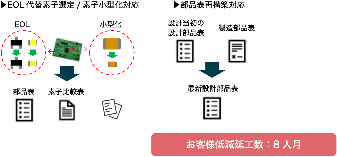代替素子検討のための最新設計部品表がないといったように、事前情報が揃っていない状態でも柔軟に対応可能です。また、代替品の選定だけでなく、EOLに関連した部品の再設計もご依頼頂き、チップ抵抗やチップコンデンサなど、基板の小型化も実現しています。