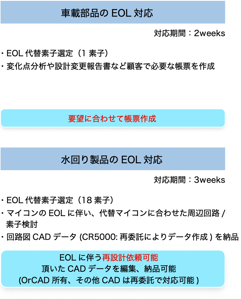 お客さまの設計人員はEOL対応ではなく、新規開発にあてたいと考えており、EOLに向けた事前調査から代替品の調査、関連業者とのやりとりまで、ワンストップで依頼できる企業を探されていました。