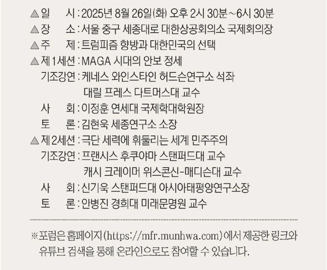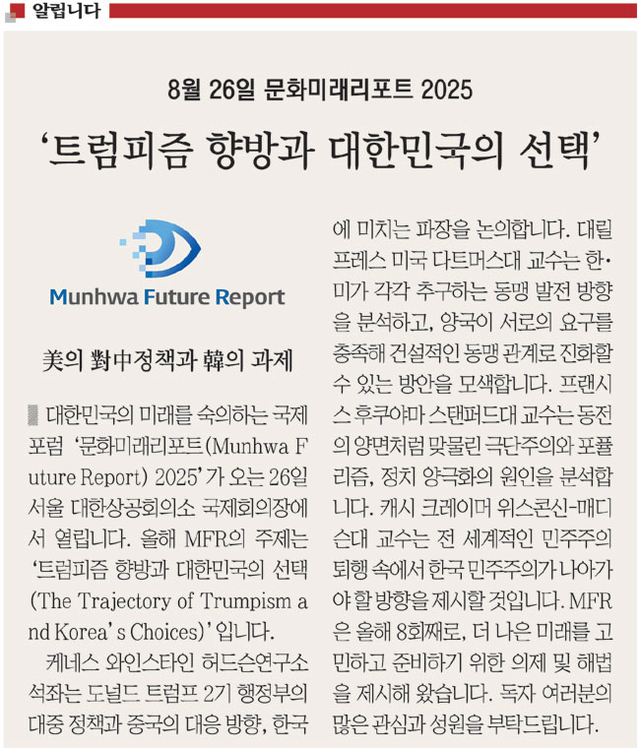 대한민국의 미래를 숙의하는 국제포럼 ‘무료 바카라 게임미래리포트(Munhwa Future Report) 2025’가 오는 26일 서울 대한상공회의소 국제회의장에서 열립니다. 올해 MFR의 주제는 ‘트럼피즘 향방과 대한민국의 선택(The Trajectory of Trumpism and Korea’s Choices)’입니다.