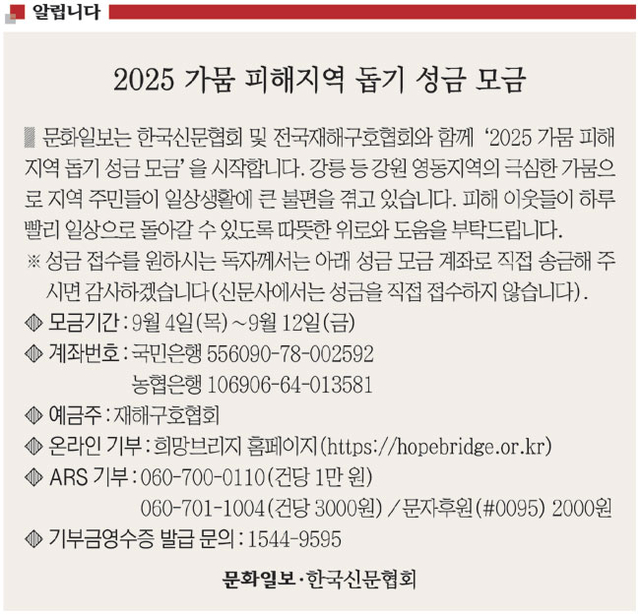 바카라사이트 제작는 한국신문협회 및 전국재해구호협회와 함께 ‘2025 가뭄 피해 지역 돕기 성금 모금’을 시작합니다. 강릉 등 강원 영동지역의 극심한 가뭄으로 지역 주민들이 일상생활에 큰 불편을 겪고 있습니다. 피해 이웃들이 하루빨리 일상으로 돌아갈 수 있도록 따뜻한 위로와 도움을 부탁드립니다.