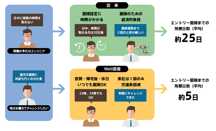 今回の取り組みにより、これまでエントリーをいただいてから、初回面接を設定、最終面接まで約25日かかっていたところを、エントリーから最終面接にかかる所要期間は約5日間に短縮可能。内定までに必要なご来社は最終面接の1回のみとなります。※対面での面接希望者にはこれまで通り、ご来社いただいての面接も実施いたします。