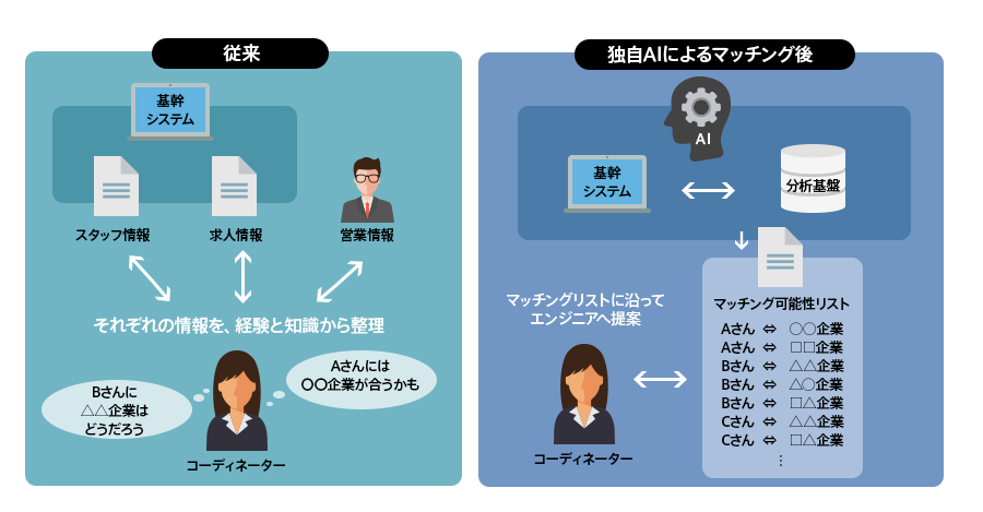 これまで当社へ登録したエンジニアに求人案件をご紹介する際、専任のキャリアコーディネーター(以下、コーディネーター)が社内基幹システムへアクセスし、経験や希望などのマッチング必要項目をデータベースにて照合。その後、コーディネーター自身の過去の知識・経験に基づき、スタッフ情報と募集中の企業・求人情報のマッチングを行っていました。