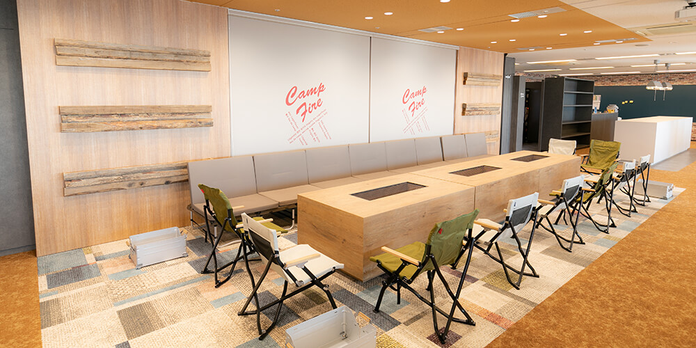 クリエイティブスペースには、本物のキャンプファイアーをイメージした大きなテーブルを配置。最大16名が着席することができ、キャンプファイアーを囲むかのように自然と人が集まり、会話が生まれやすい雰囲気を演出します。通常の会議室で行うミーティングとは雰囲気を変えたい時や、リラックスして会話をしたい場合に最適です。