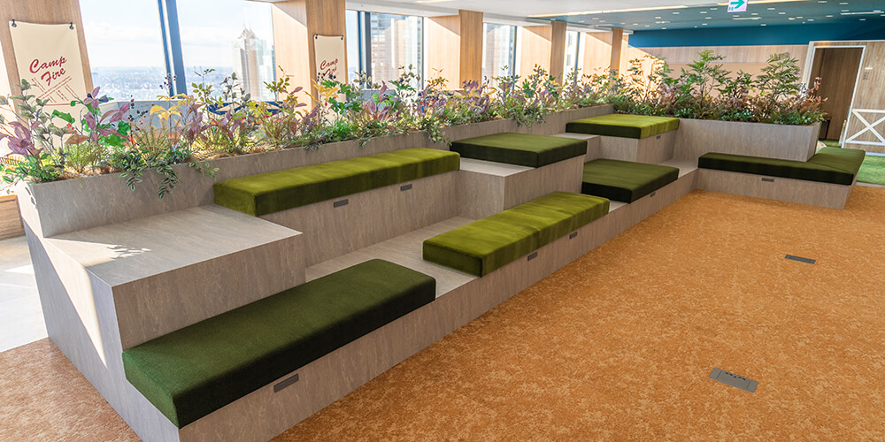 川辺の岩場を模したひな壇式のソファーも配置。ひな壇式のソファーはより多くの人が着席できるメリットがあり、キャンプファイアーというテーマから、川沿いの岩場をイメージした、思わず登りたくなってしまうデザインになっています。セミナーや勉強会などのイベント開催時に、通常の椅子・テーブルに着席するのとは違った視点で参加することができ、一つのスクリーンを見やすいようレイアウトしています。