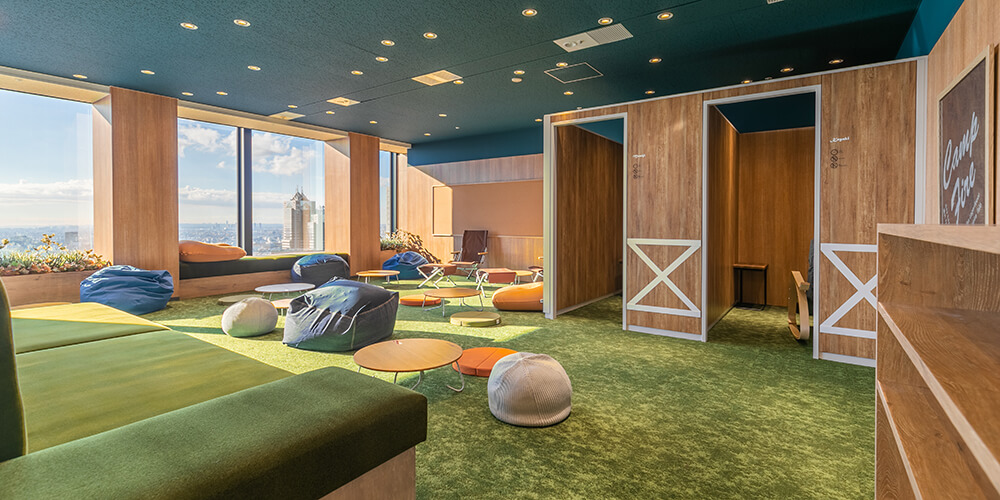 一息つきたい休憩時のために、靴を脱いで寛げる芝生調のカーペットスペースも。天井は夜をイメージしたダークカラーとなっており、ライトを星座のように設置することで、夜空を見上げているかのように肩の力を抜いて休憩することのできるスペースとなっています。また、このスペースには酸素発生装置を設置しており、森林にいるのと同じ酸素濃度の空気の中で疲れた体と脳を休ませることができます。短時間の昼寝にも適した個室のリラックスブースもあり、オンとオフの切り替えを促して業務効率の向上を目指します。