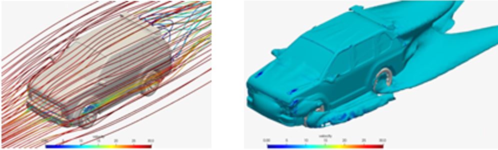 3D CADデータ、高精度3Dハンドスキャナーで測定したデータを利用した空力解析を実施。車輌全体とエンジンルーム内までの空気の流れから、流速、流量、圧力分布、温度分布まで対応可能です。