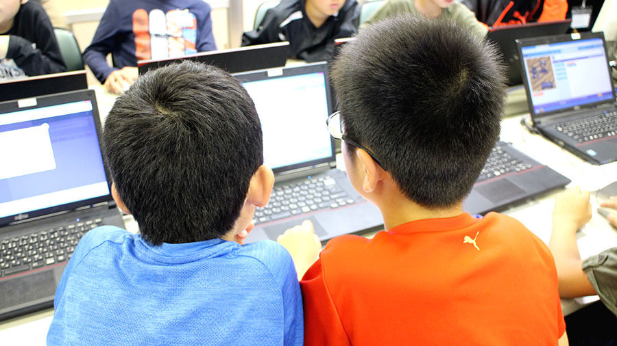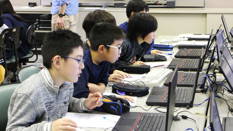 最初のステージは難なくクリア。徐々に難易度が上がっていくと悩みはじめる生徒さんも出てきました。ですが、そこはこどもLab.のコーチ陣がしっかりサポート!少しヒントを伝えるだけで、ひらめいたようにミッションをクリアしていきます。また、隣のお友達同士で教えあったり、競いあったりしながら進めている生徒さんもいて、和気藹々とした雰囲気で進んでいきました。