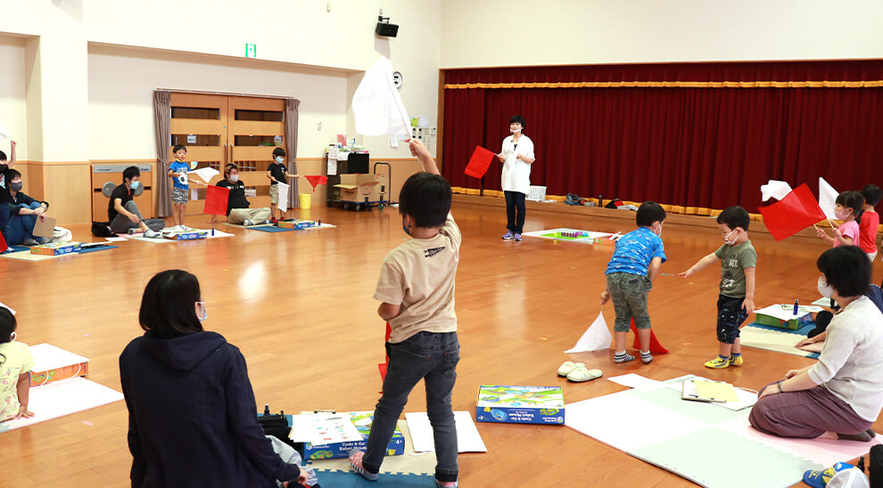 この日は、まず赤と白の旗揚げゲームを行いました。 人間同士で対戦してゲームを楽しんだ後は、大関が扮するロボットと子供たちが対戦します。 ロボットに向かって、子供たちは「赤あげて」「白上げて」と指示を出しますが、ロボットは手を挙げません。 そこで、「なぜロボットは手を挙げなかったのだろう?」と子供たちに問いかけます。