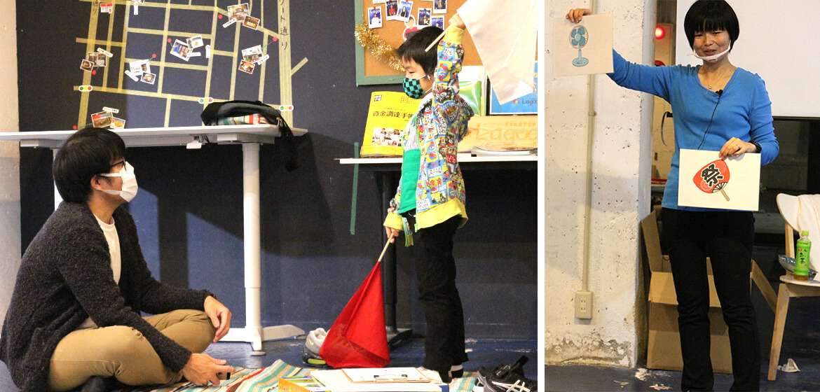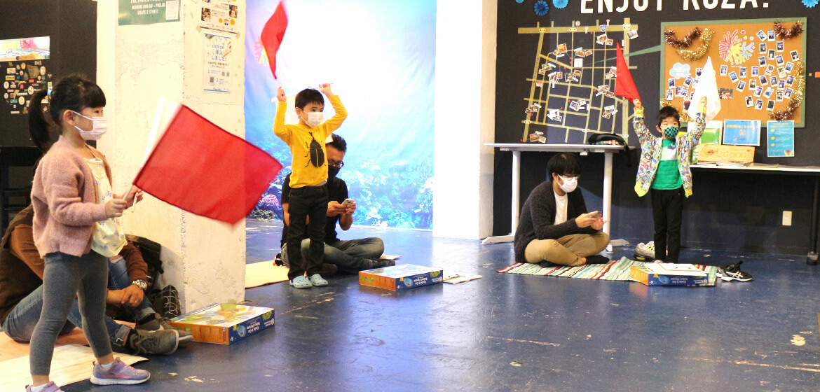 まずは導入として、「プログラムとは何か?」を子どもたちに体感してもらうために、親子で旗上げゲームを行います。誰もが知っている昔ながらの旗上げゲームを通じて「定義」「命令」というプログラミングには欠かせない大切な要素を体感します。