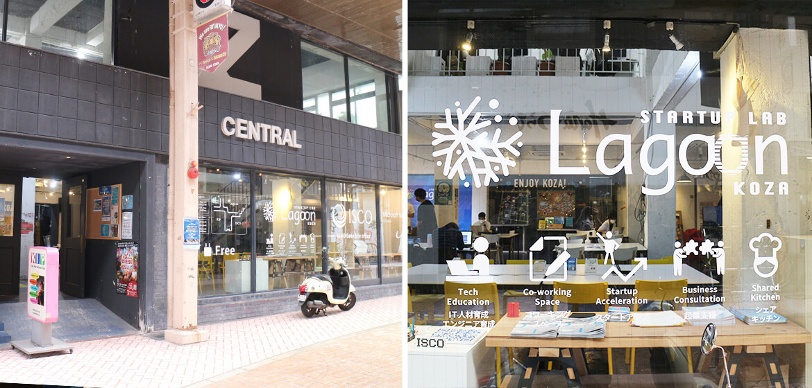 今回のWWOで当社がワーケーション先として選んだのは、沖縄本島のほぼ真ん中に位置する沖縄市胡屋(通称:コザ)。嘉手納基地が近く、アメリカの文化と沖縄の文化が入り混じる独特な雰囲気を持つ街です。そんな胡屋にある「STARTUP LAB Lagoon」を今回のワークスペースとしてお借りしました。