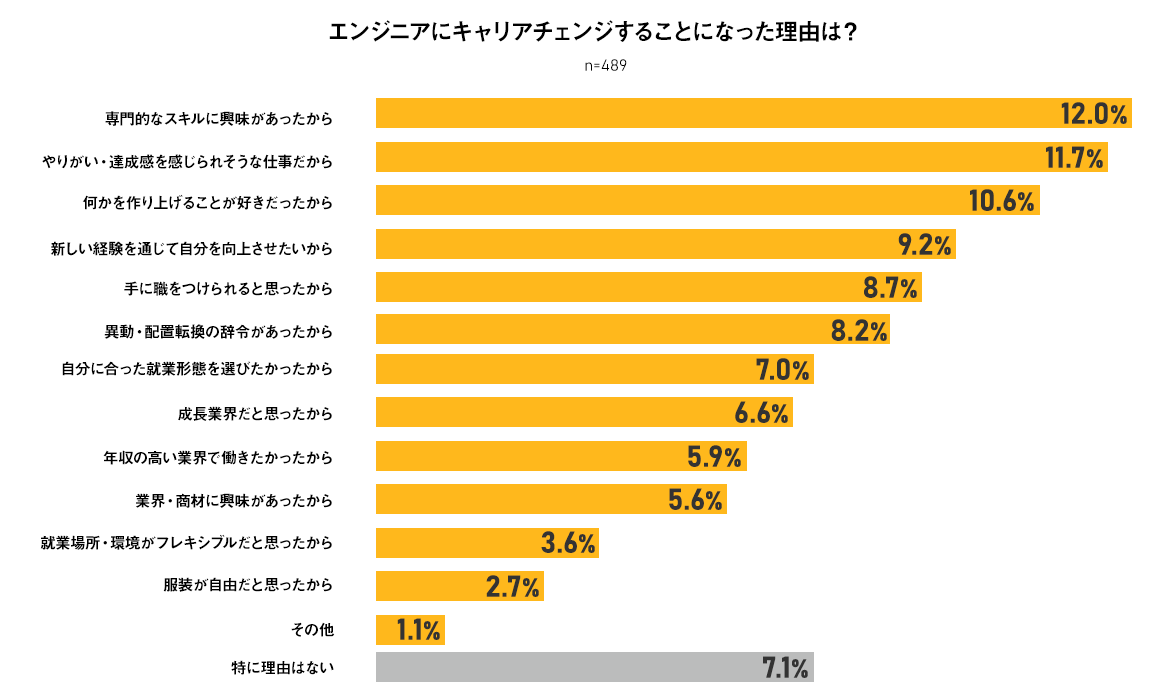 生産工程(16.7%)やクリエイティブ職(11.7%)など設計・開発エンジニアと親和性の高い業務に就いていた方が合計28.4%を占める。より高い専門性を身に付け、上流にチャレンジしたり、幅を広げるためにエンジニアにキャリアチェンジしたと考えられる。また営業職(16.7%)という異業種からキャリアチェンジを図った方も多く、この3職種のみでエンジニアへキャリアチェンジしたうちの45.1%を占める。