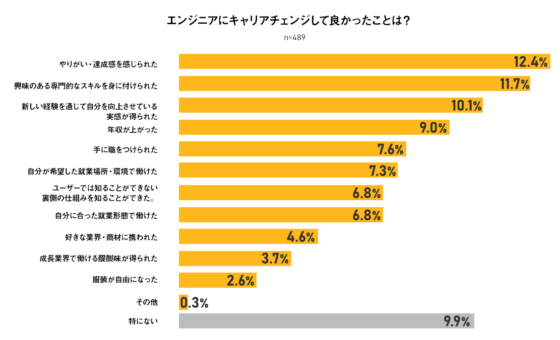 他業種経験からキャリアチェンジした理由は「専門的なスキルに興味があった(98名)」「やりがい・達成感を感じられそうな仕事だから(95名)」と約2割にあたる方が回答。キャリアチェンジ後にも「やりがい・達成感」「興味のある専門的なスキル」を得られたと回答している。