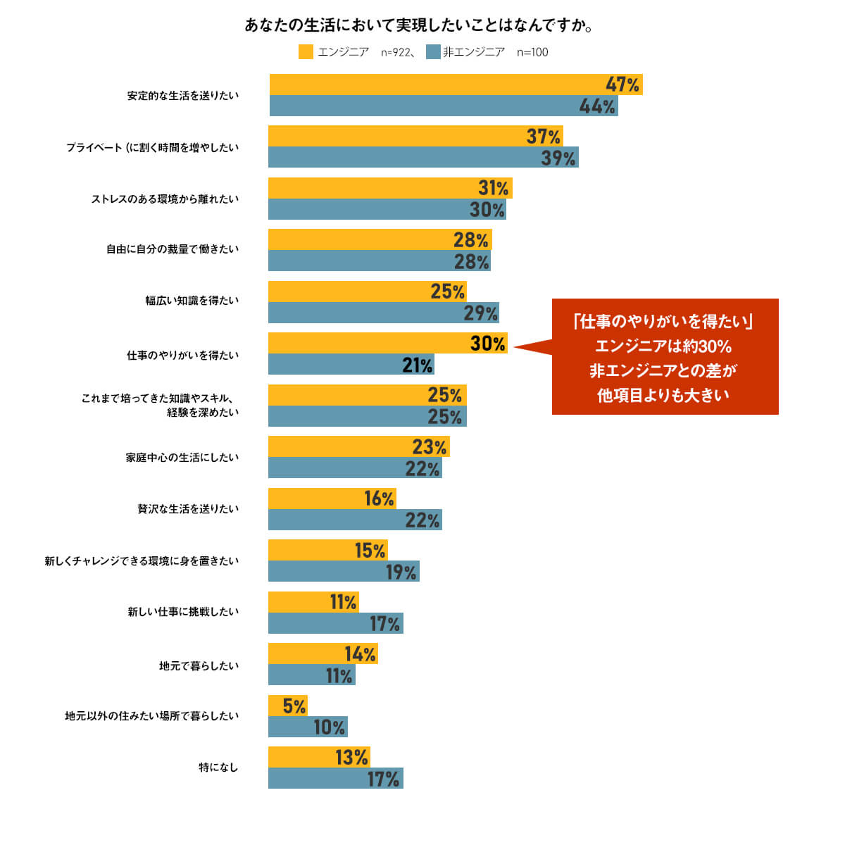 「生活において実現したいこと」について、エンジニアと非エンジニア職で6ポイント以上の差が出たのは、「仕事のやりがい(エンジニア:30%、非エンジニア:21%)」、「贅沢な暮らしをしたい(エンジニア:16%、非エンジニア:22%)」、「新しい仕事に挑戦したい(エンジニア:11%、非エンジニア:17%)」の3項目。新しい仕事への挑戦意向が低いのは、エンジニア職として専門性ややりがいを得てキャリアチェンジ欲求が低い可能性が考えられる。