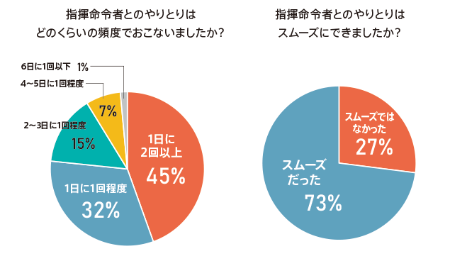 SlackやZoomなどのオンラインツールを以前から使っている職場が多いことから73%がスムーズにやり取りができたと回答しました。一方で就業後日が浅いなど指揮命令者と関係性ができていないケースでは、チャットツールで気軽に声をかけづらいといった声や、チャットツールを導入していない職場などでは、これまで口頭でコミュニケーションしていたこともメール文面を作成するので文面作成時間がかかり、レスポンスにも時間がかかるケースも見られました。
