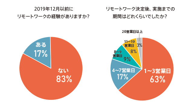 83%の派遣エンジニアは、新型コロナウイルス感染拡大以前にリモート派遣経験なしリモートワークが決まってから開始までは3日以内が63%、1週間以内が80%