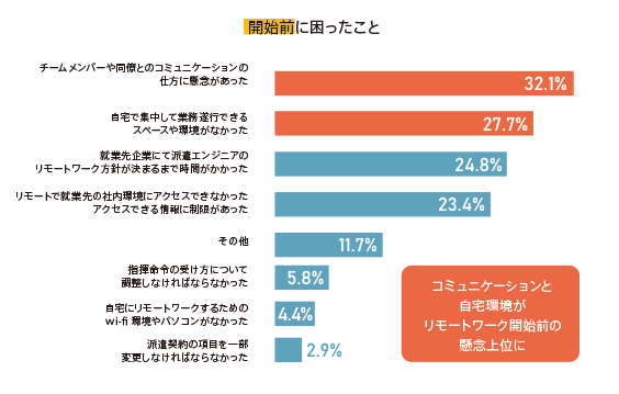 7割ほどのエンジニアが開始前に課題あり。チームメンバーや同僚とのコミュニケーション(32.1%)、集中して業務遂行できる自宅環境(27.7%)