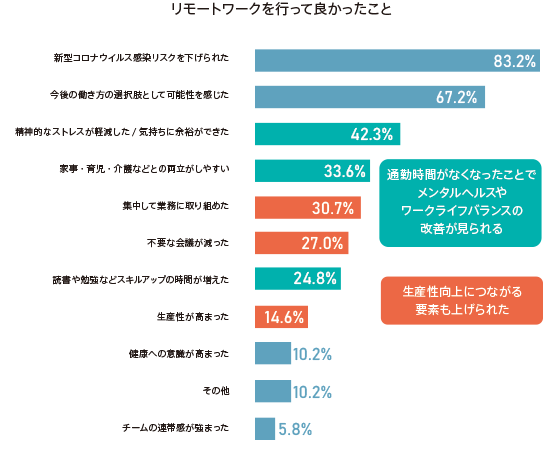 - 良かったことは「今後の働き方の選択肢として可能性を感じた(67.2%)」「精神的なストレスが軽減/気持ちに余裕ができた(42.3%)」※感染リスクの低減を除く
