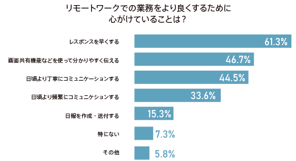 エンジニアの多くがコミュニケーションに関する工夫を実施レスポンスを早くする(61.3%)、画面共有機能などを使って分かりやすく伝える(46.7%)、日頃よりも丁寧なコミュニケーション(44.5%)