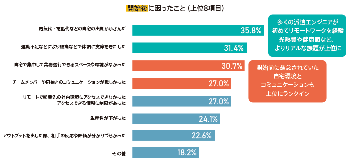 開始前に懸念されていた「集中して業務に取り組める自宅環境(30.7%)」「チームメンバーや同僚とのコミュニケーション(27.0%)」の他に、より現実的な光熱費や健康面での課題が上位に上がりました。