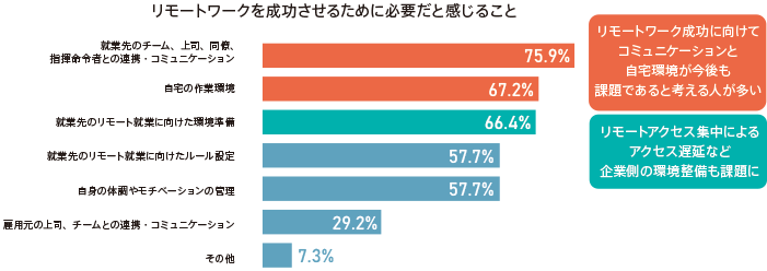 - リモートワーク成功に重要なことは「コミュニケーション(75.9%)」、「自宅の作業環境(67.2%)」