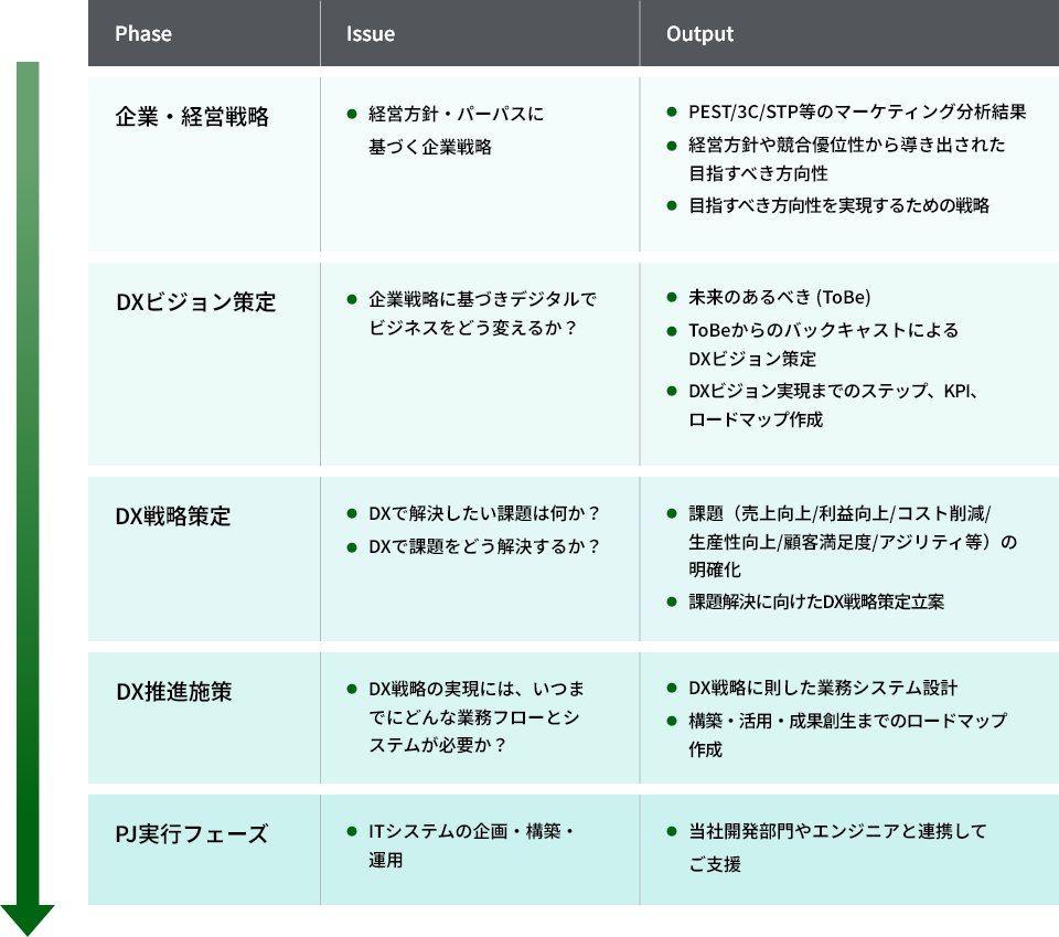- DX推進のフェーズに従いDXビジョン策定から推進施策、実装フェーズまでシームレスなサービスを提供します。