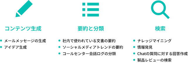 ChatGPTのような大規模言語モデル(LLM)を活用可能なAzure OpenAI Serviceの導入を行っています。チャットポットだけではなく、コンテンツの生成や文書の要約、検索への活用など幅広い用途でのご活用を支援しています。