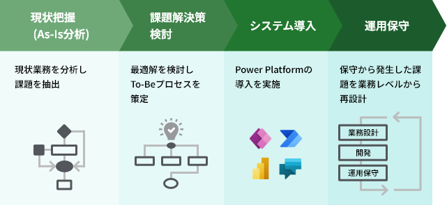 業務分析実施による課題抽出を行い、最適な解決策提示を実施する業務コンサルティングサービスからPower Platformの構築・保守まで一気通貫でサービス提供することにより、あるべき業務を実現します。