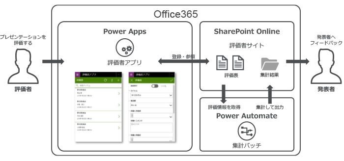 レジデントのプレゼンテーション評価をPower Appsアプリから入力し、評価結果をPower Automateで集計 → SharePointで配置・公開。一連の仕組みをOffice365テナント上に構築しました。
