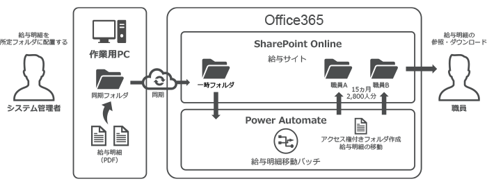 給与明細 PDF をPower Automateを使ってShare Pointにて自動配布。システム管理者による給与明細の印刷と郵送の工数削減に加え、各職員の専用フォルダーを作成する事で、セキュリティを担保しながら職員の利便性も向上しました。