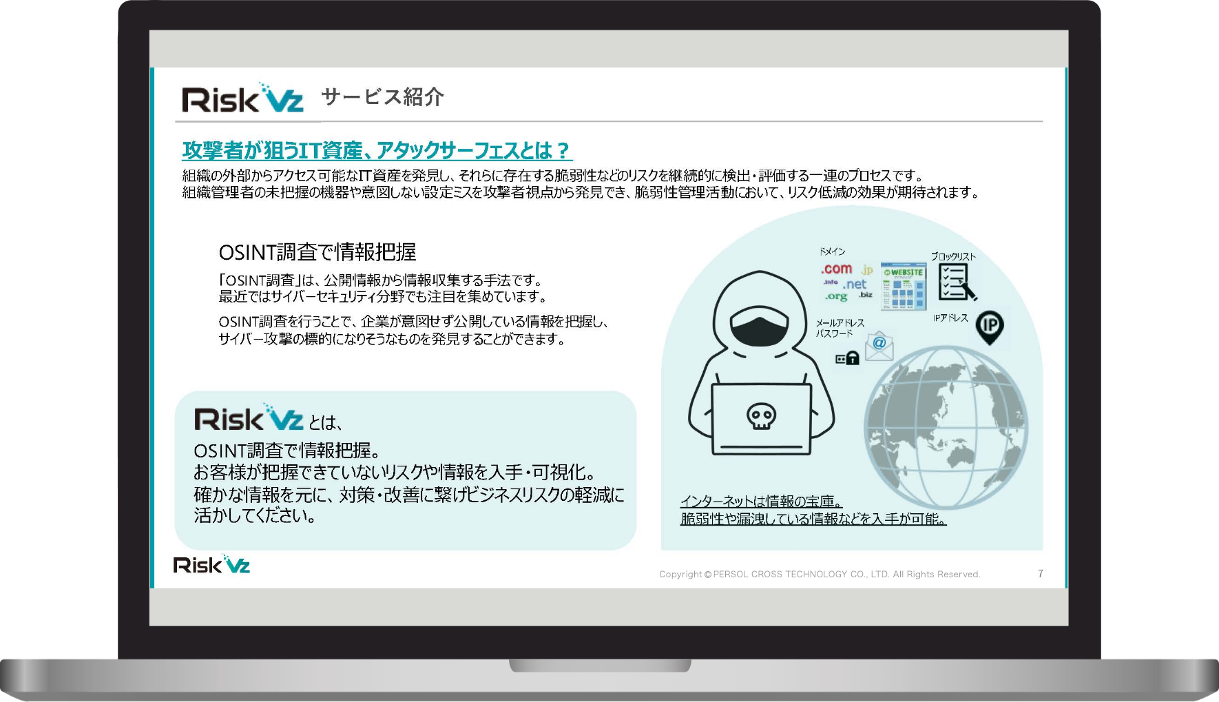 お客さまが把握できていないリスクや情報を入手・可視化することで、ビジネスリスクの軽減に活かす「RiskVz」。 そのサービスの全容をご紹介いたします。